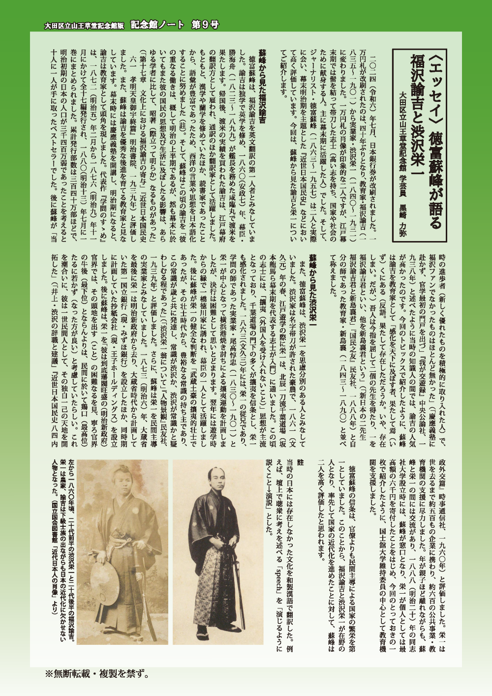 徳富蘇峰が教育家・福沢諭吉に対面したエピソードのほか、蘇峰からみた諭吉と実業家・渋沢栄一の人物評等を紹介しています。