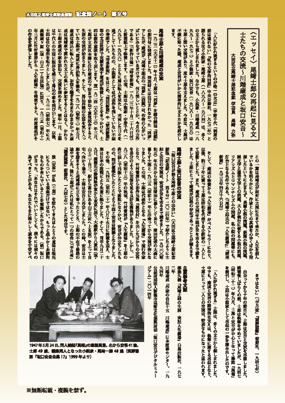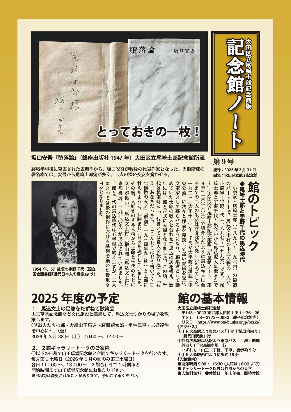 大田区立山王草堂記念館、尾﨑士郎記念館担当学芸員黒崎さんから次の記念館ノートが発行されましたのでご案内いたします。