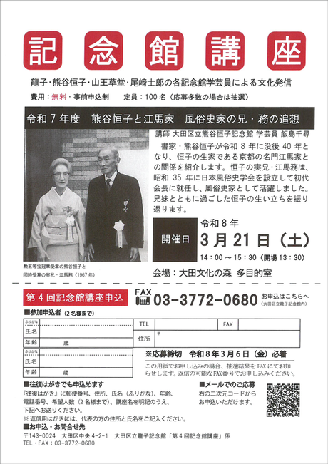 地域の情報発信を目的とした講座として、第4回記念館講座「熊谷恒子と江馬家風俗史家の兄・務の追想」が次のとおり開催されます。